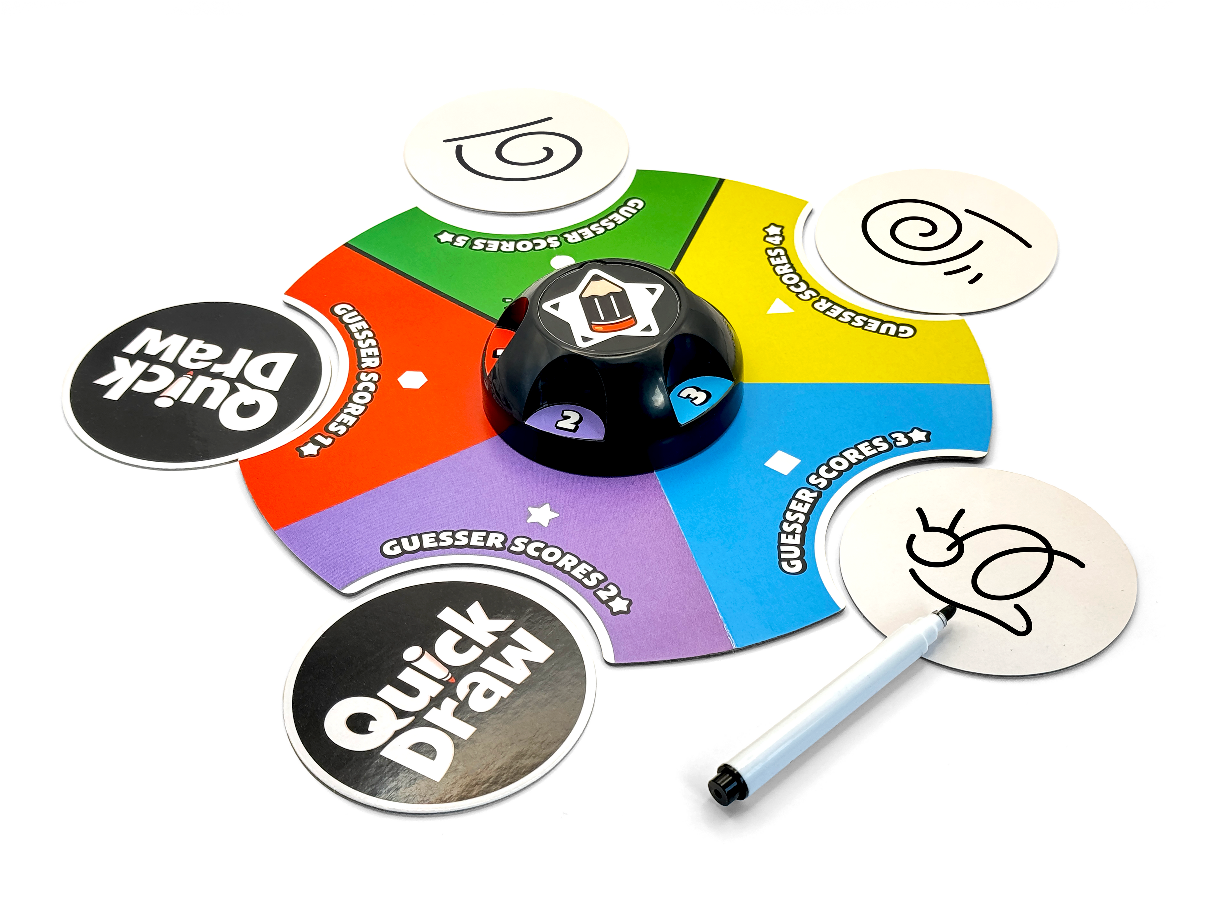 A brand new drawing game for 2024, Quick Draw blends together drawing, guessing, and quick thinking! Players take turns being the guesser, wearing blackout glasses, while others race to draw objects based on the spinner's whims. The challenge? To draw quickly and clearly enough to be guessed first!